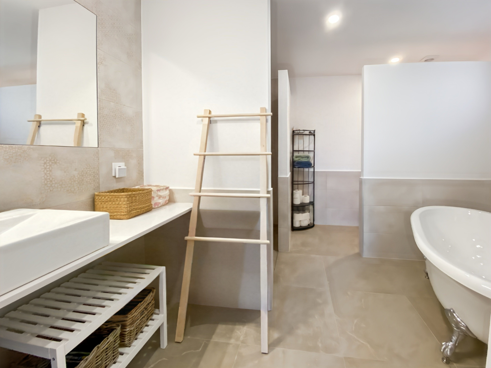 Im Außenbereich bietet der Garten Platz für einen Swimmingpool und verfügt bereits über eine Außendusche, während die 51 m² große geschlossene Garage vergrößert und mit einem Lastenaufzug ausgestattet werden kann, um alle Etagen zu bedienen.