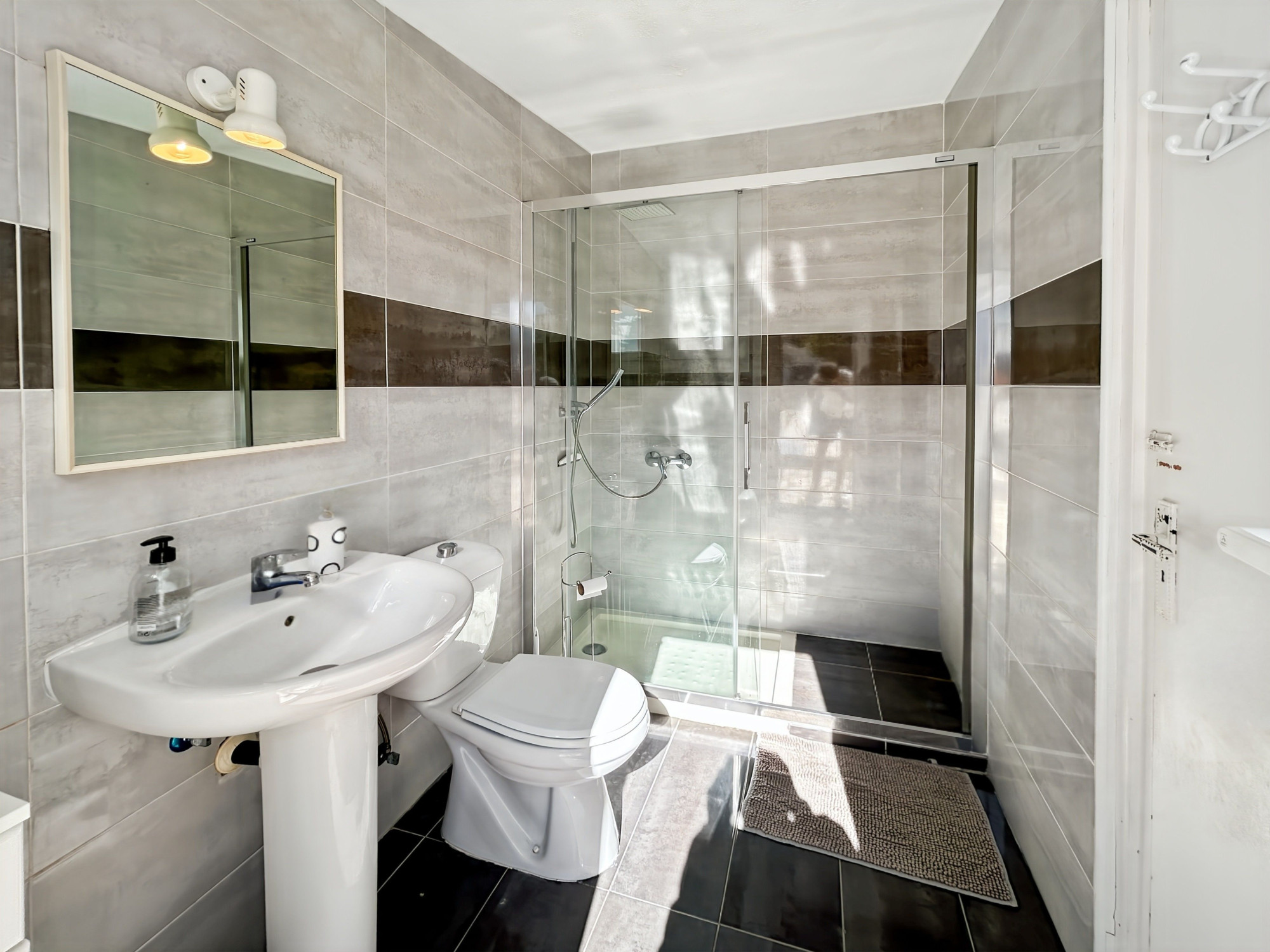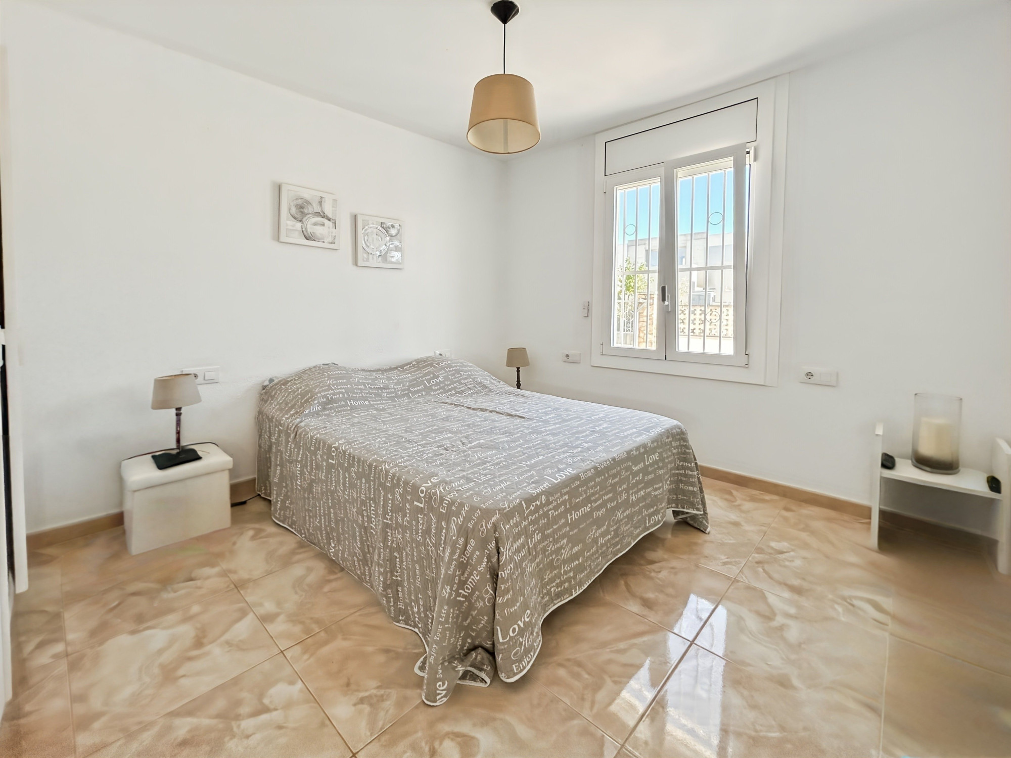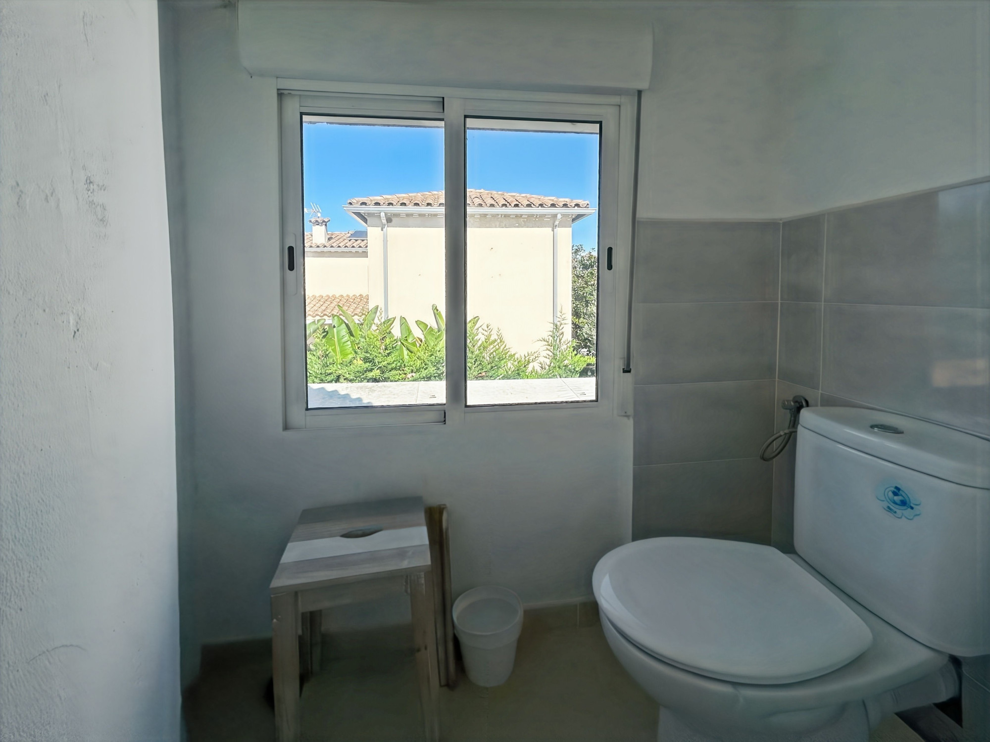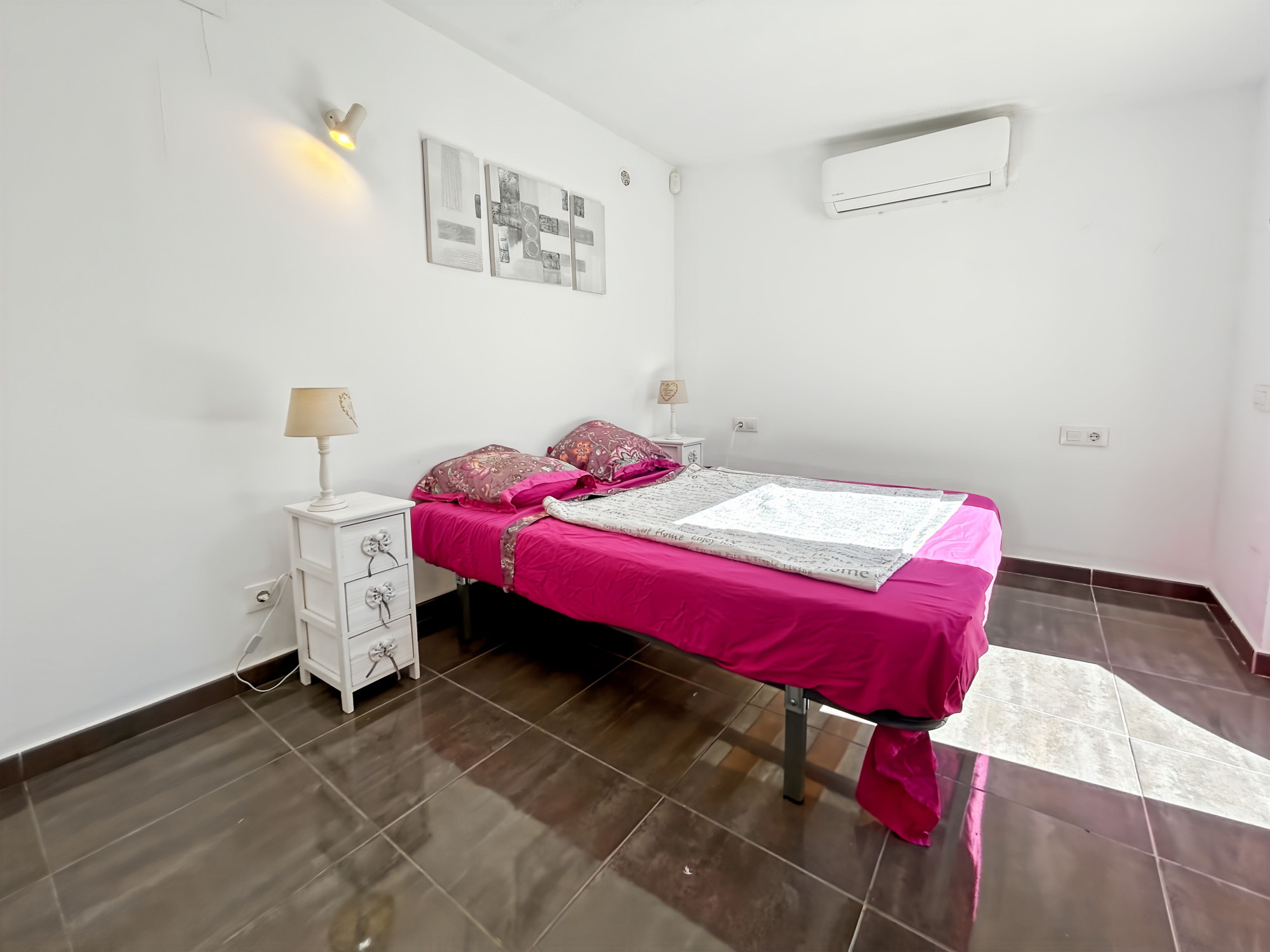 La villa principal cuenta con dos dormitorios en la planta baja con cuarto de baño, así como un dormitorio adicional en la planta superior con acceso independiente. Un garaje contiguo completa este espacio.