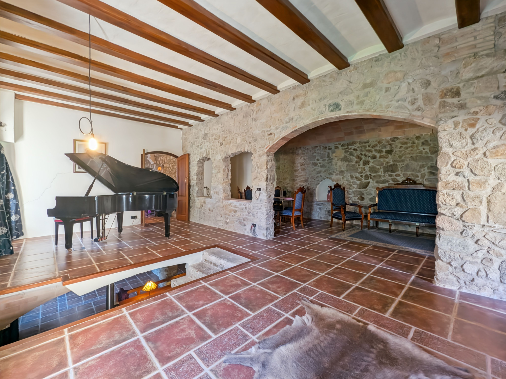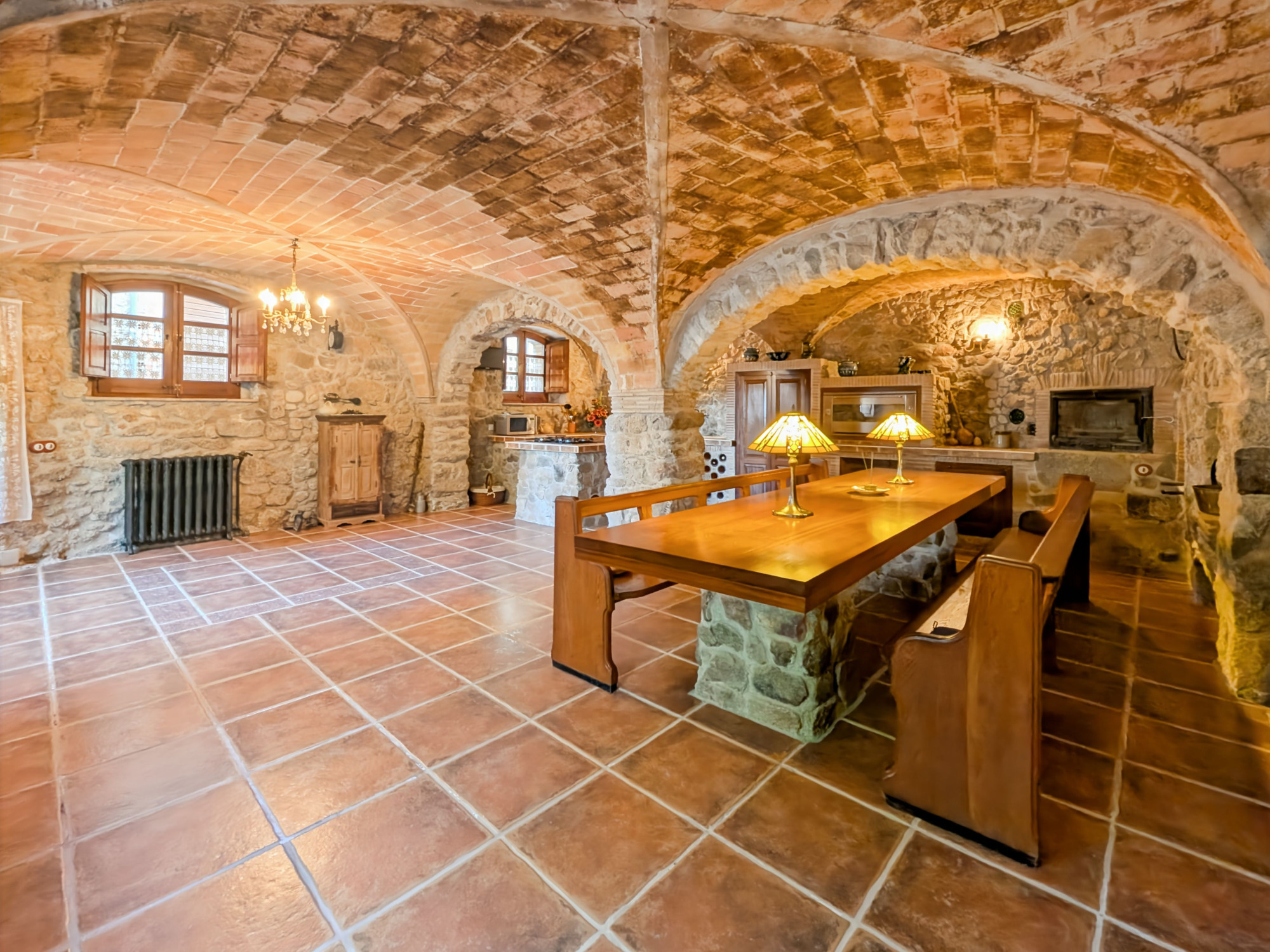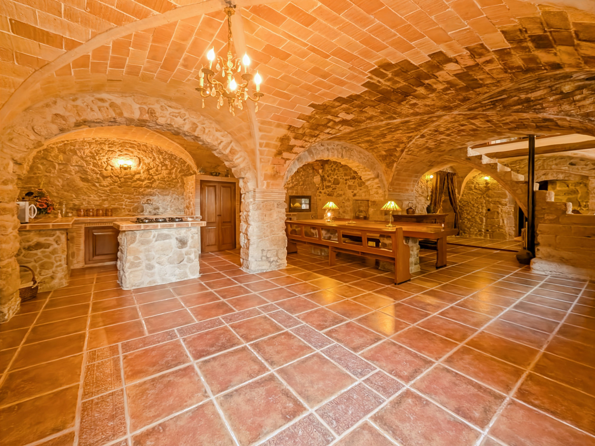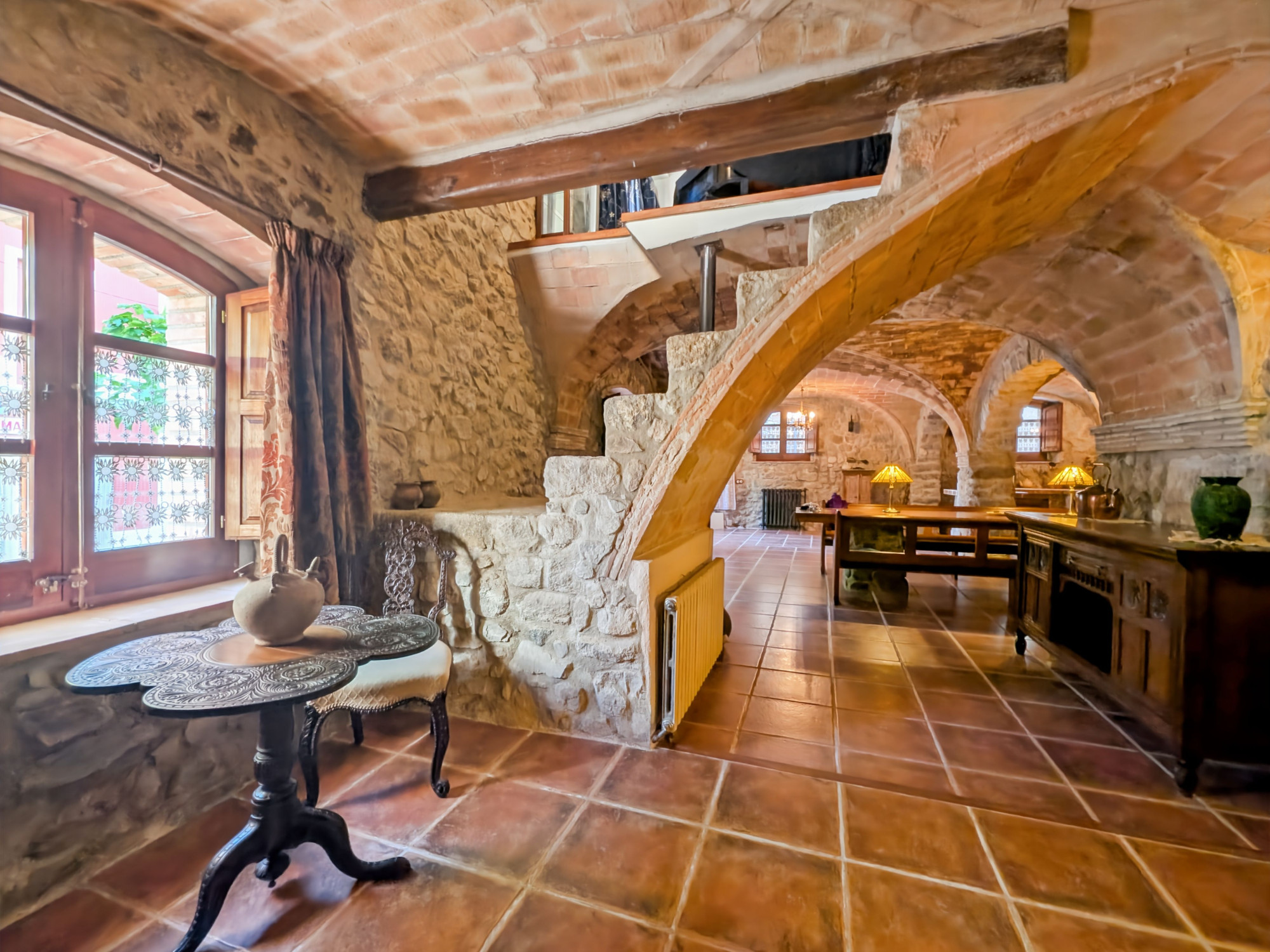 Cette maison dispose d’une cuisine voûtée avec salle à manger, cheminée et longue table fixe en bois-pierre, d’un salon, d’un grand garage et d’un puits intérieur. Le grand salon avec plafond en berceau à l'étage s’ouvre sur une terrasse.