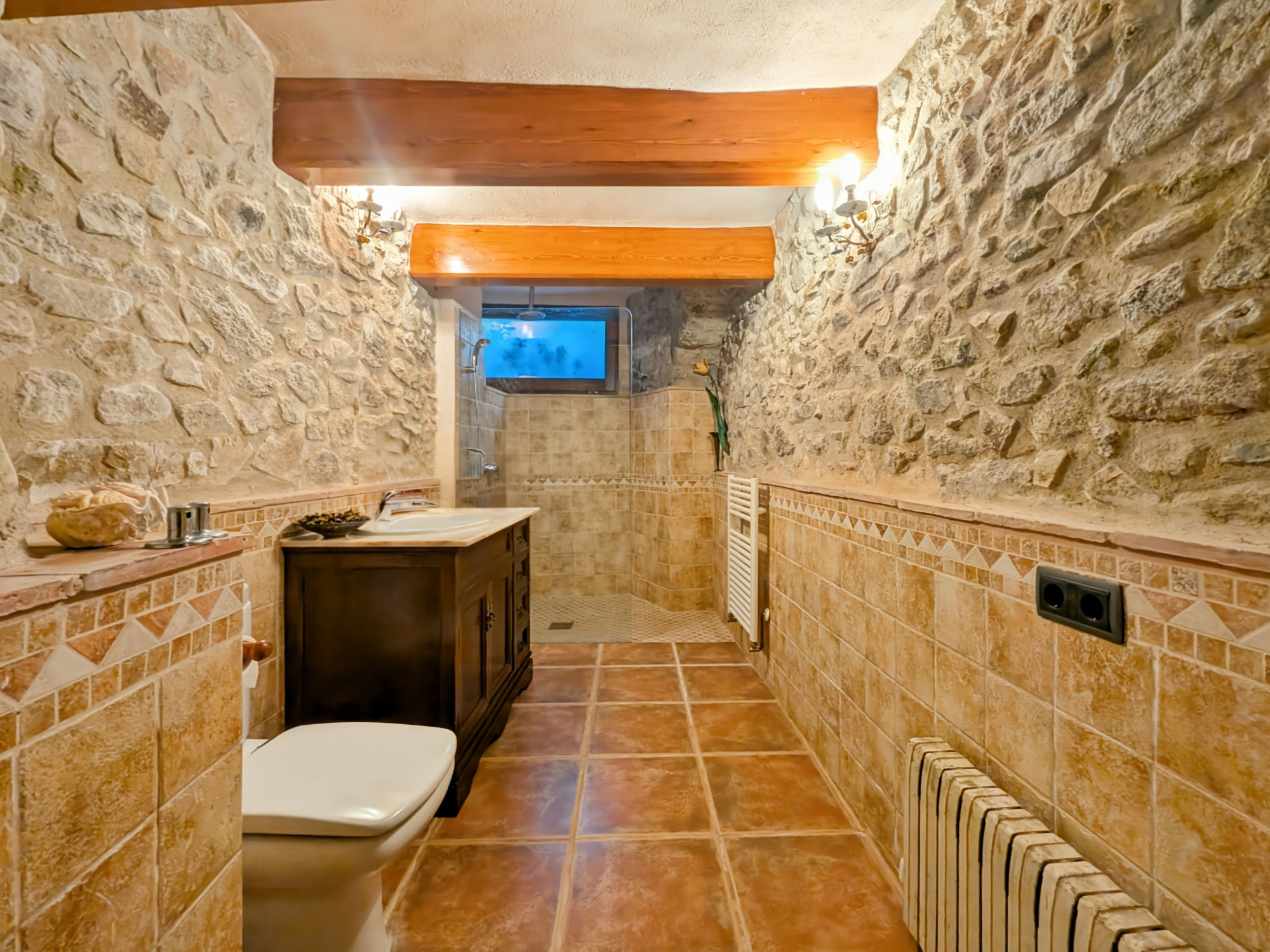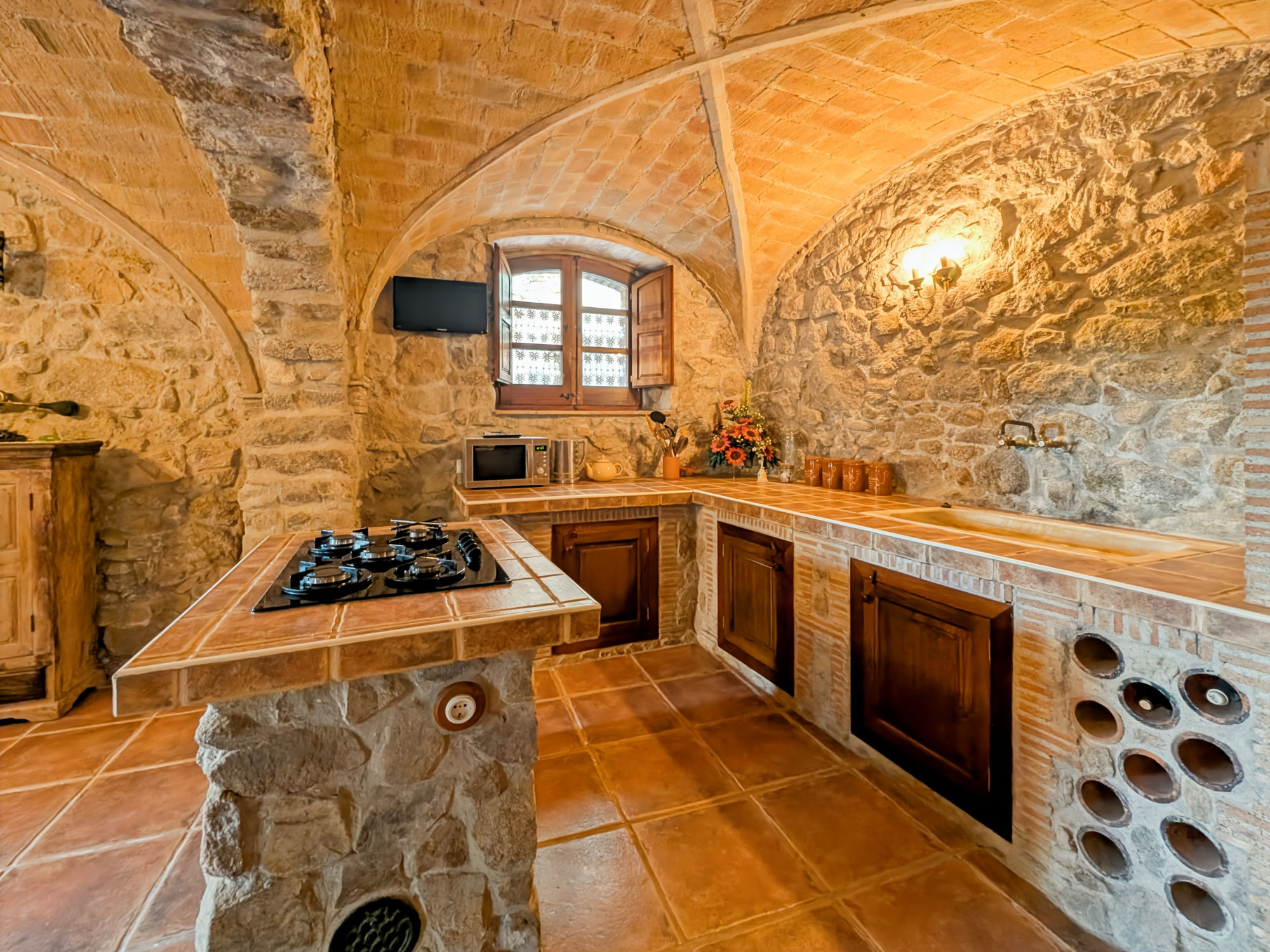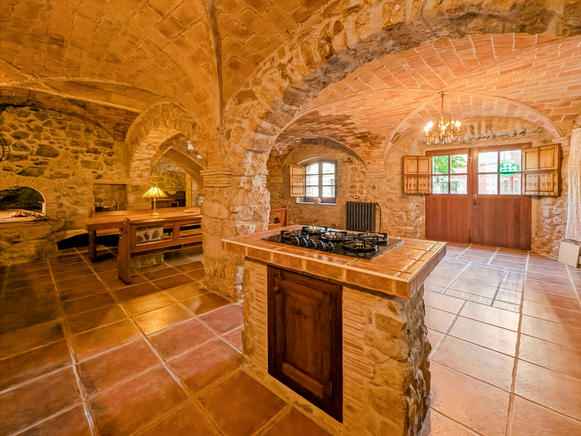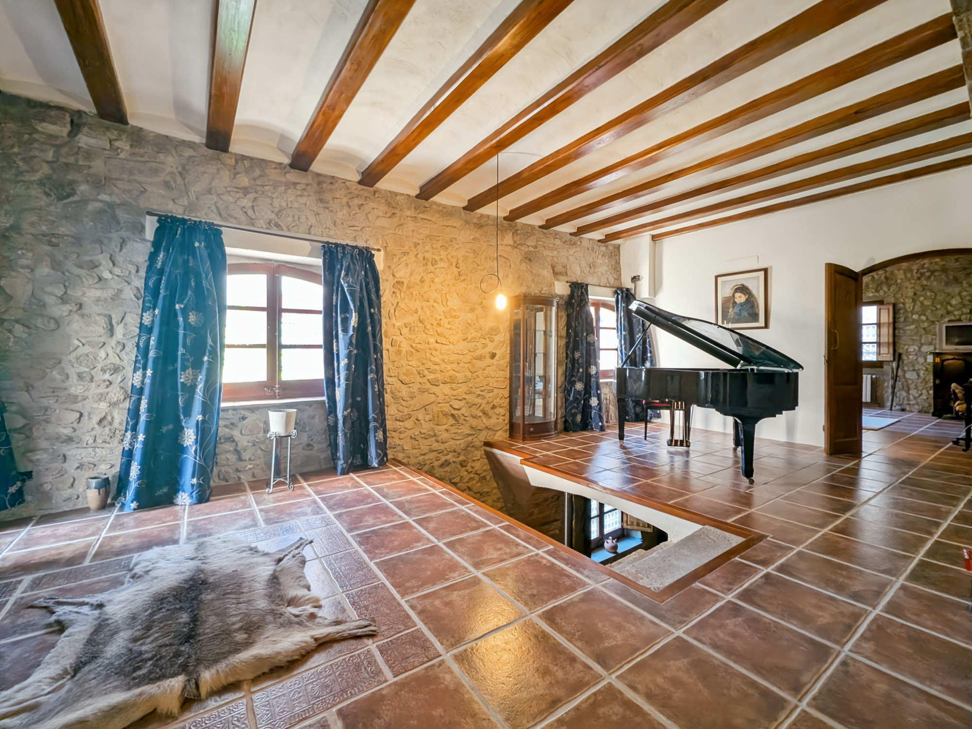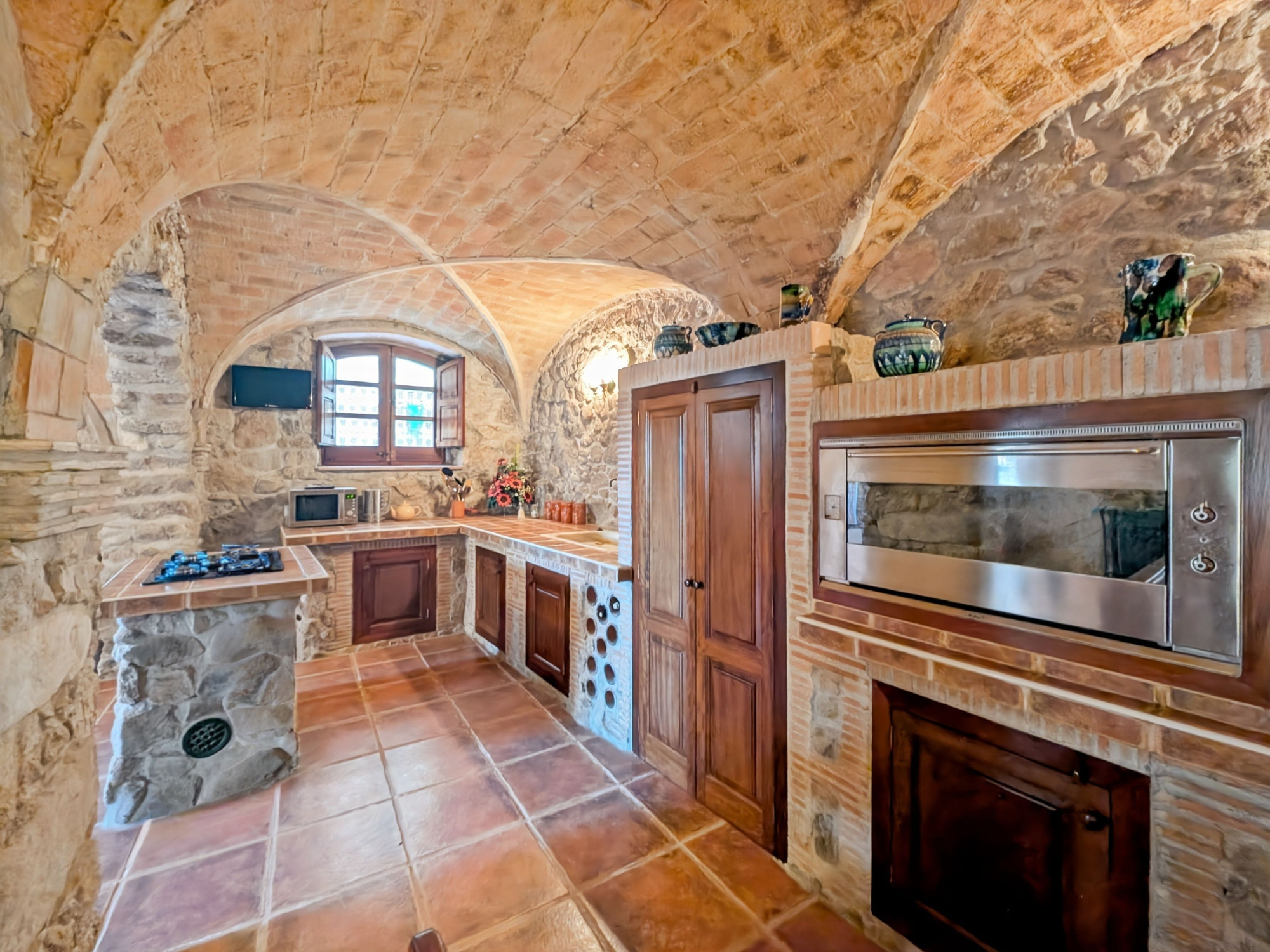 Cette maison dispose d’une cuisine voûtée avec salle à manger, cheminée et longue table fixe en bois-pierre, d’un salon, d’un grand garage et d’un puits intérieur. Le grand salon avec plafond en berceau à l'étage s’ouvre sur une terrasse.