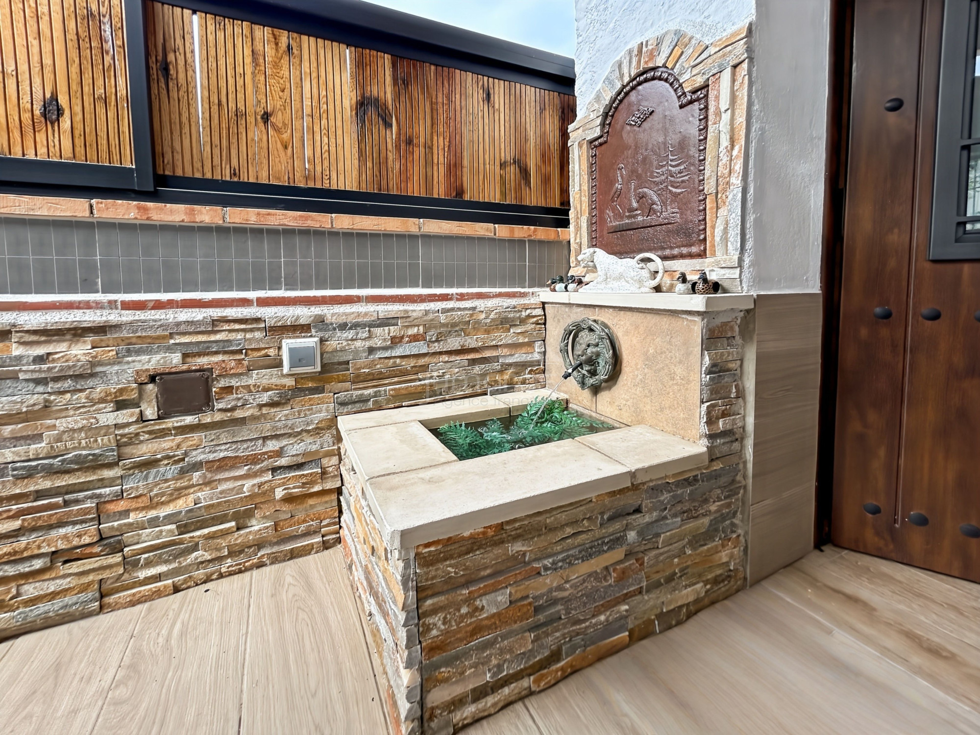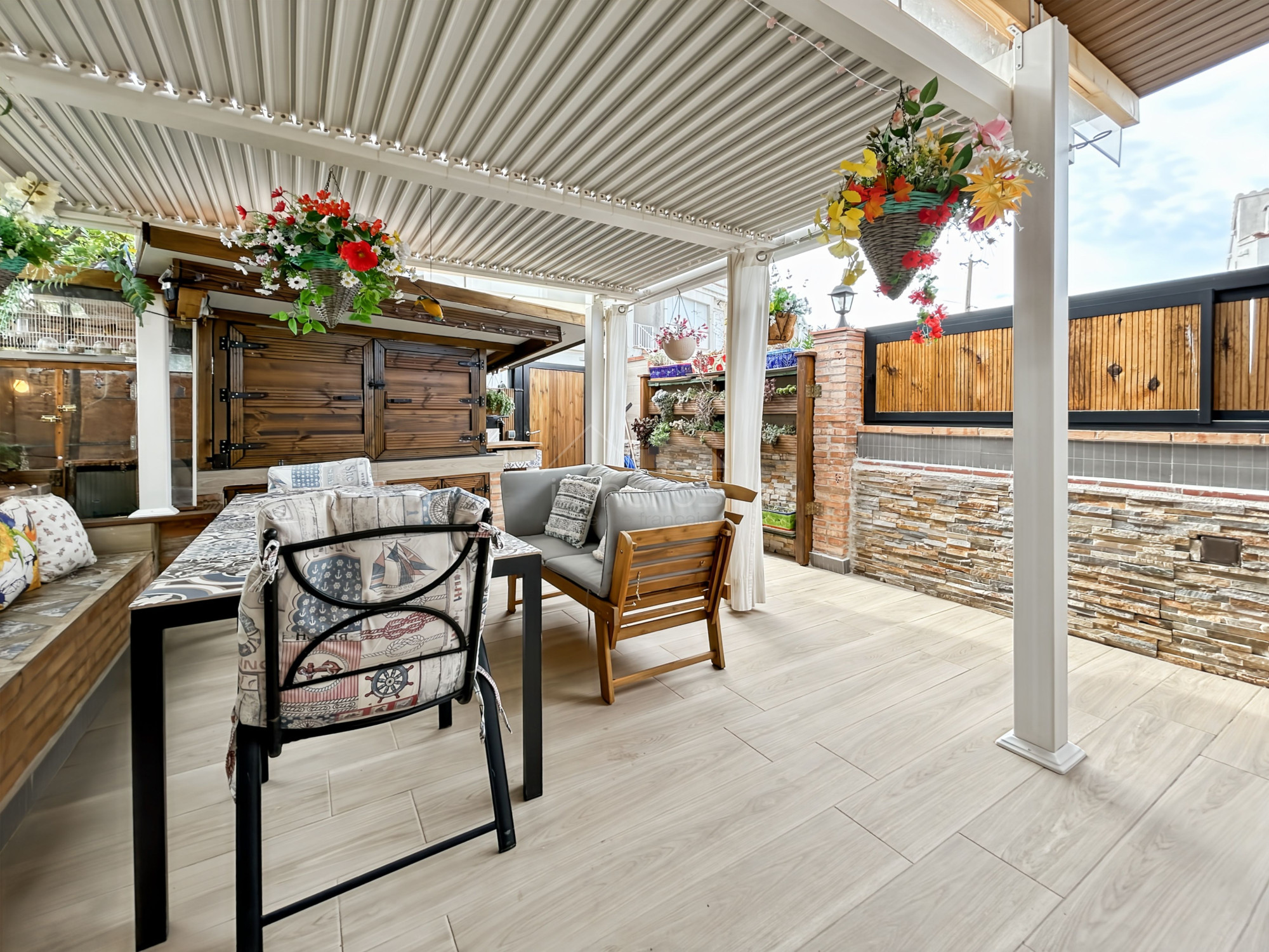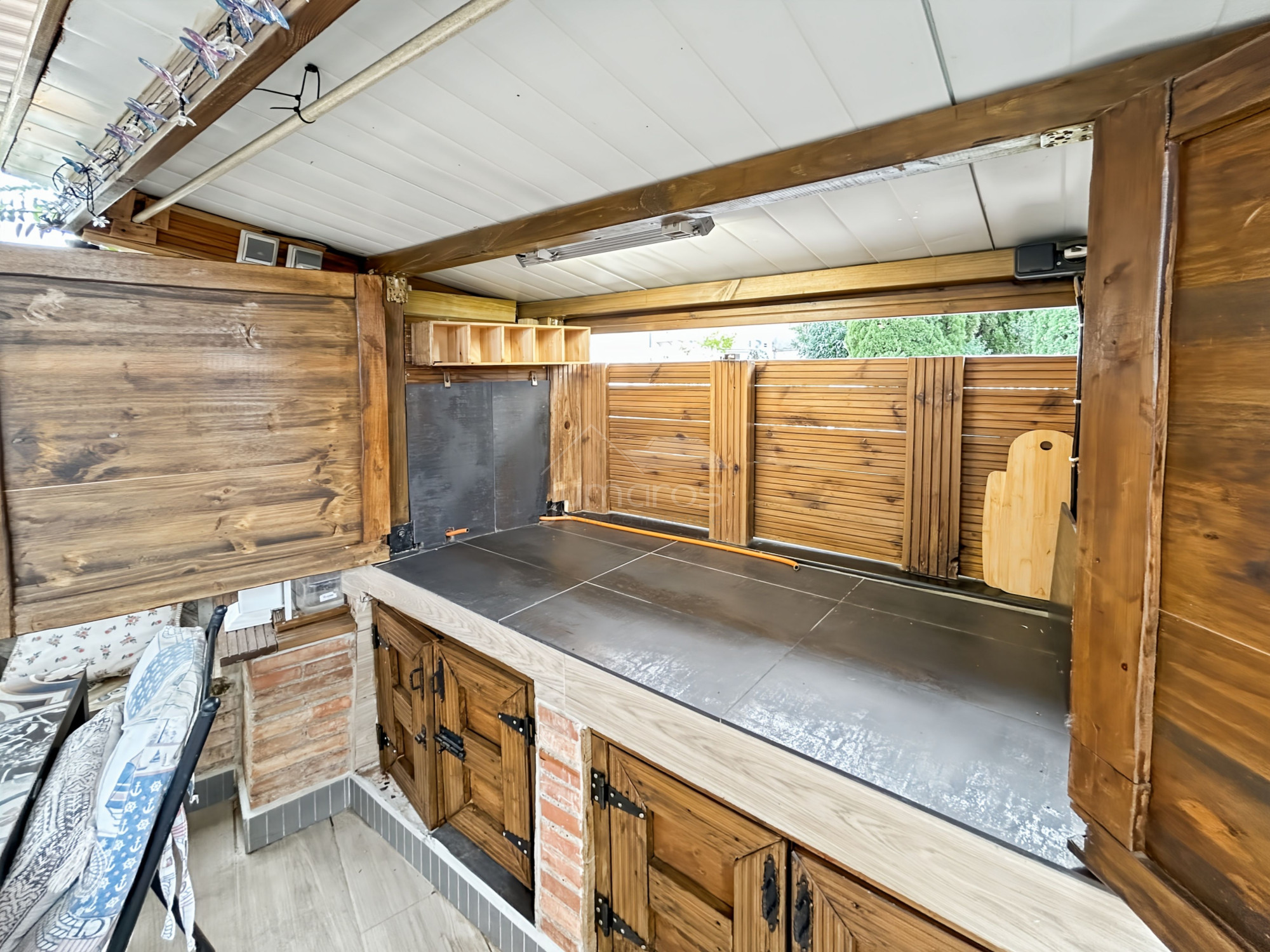 À l'extérieur, une grande terrasse avec un espace barbecue et un espace détente, ainsi que des toilettes.