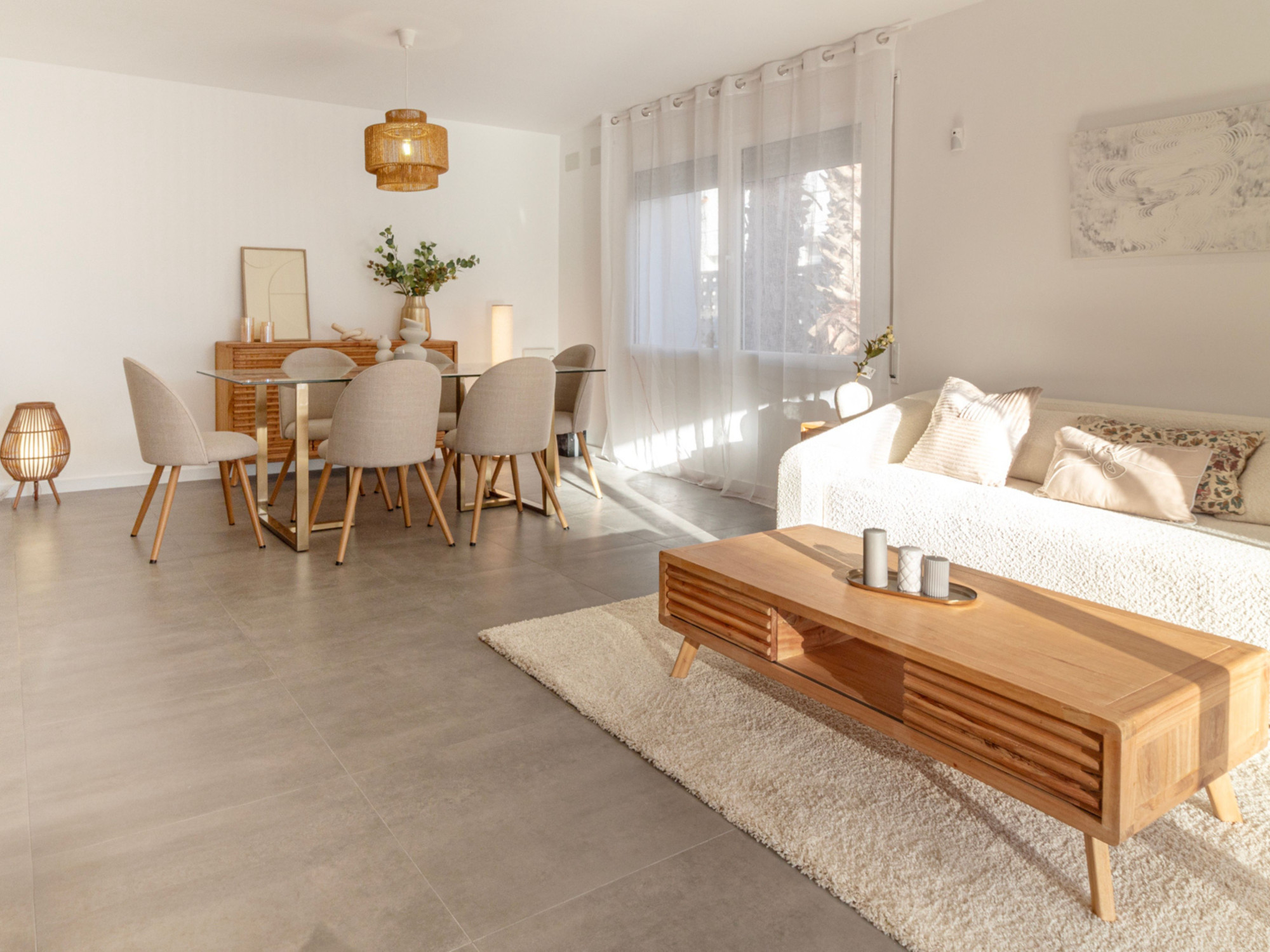 90 m² construits (environ 79 m² utiles) répartis en un salon-salle à manger très lumineux avec cuisine ouverte équipée, et accès direct à un porche privé d'environ 15 m² avec vue sur le jardin et la piscine communautaire.