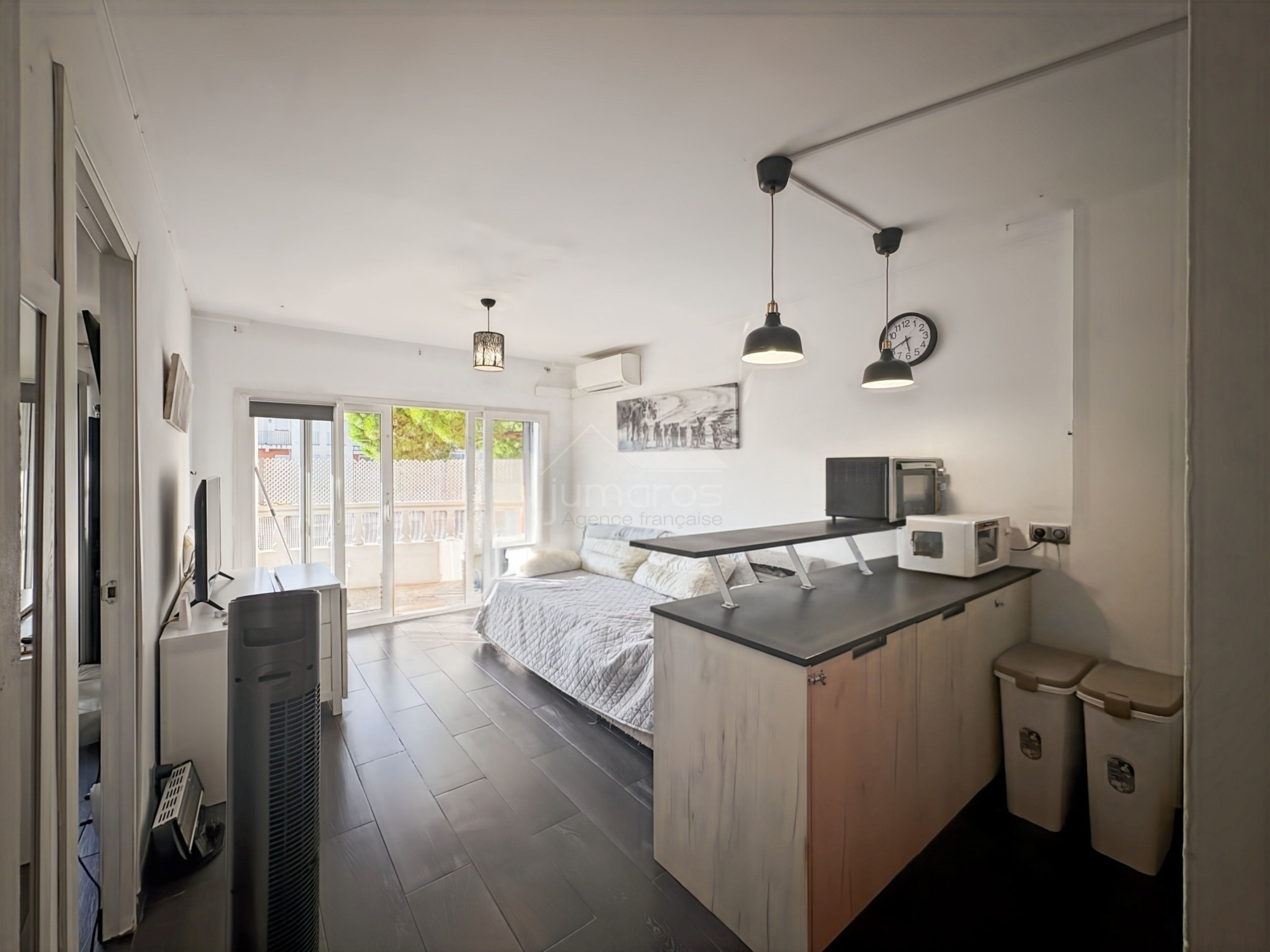 L'intérieur comprend une chambre avec salle de bains et fenêtre donnant sur l'extérieur, une cuisine américaine intégrée au salon et une terrasse très lumineuse donnant sur le jardin commun, où s'étend un agréable espace vert avec deux piscines.