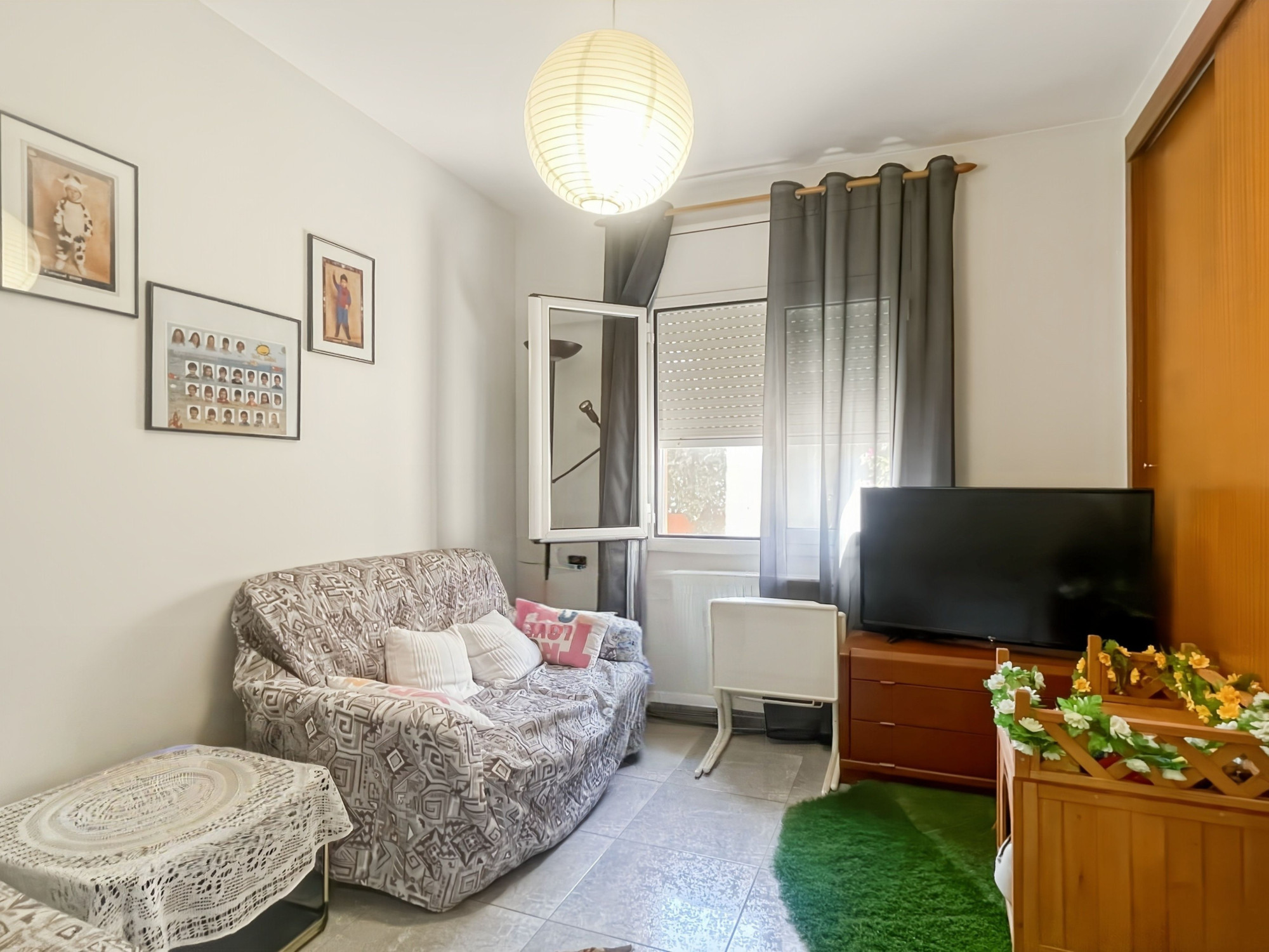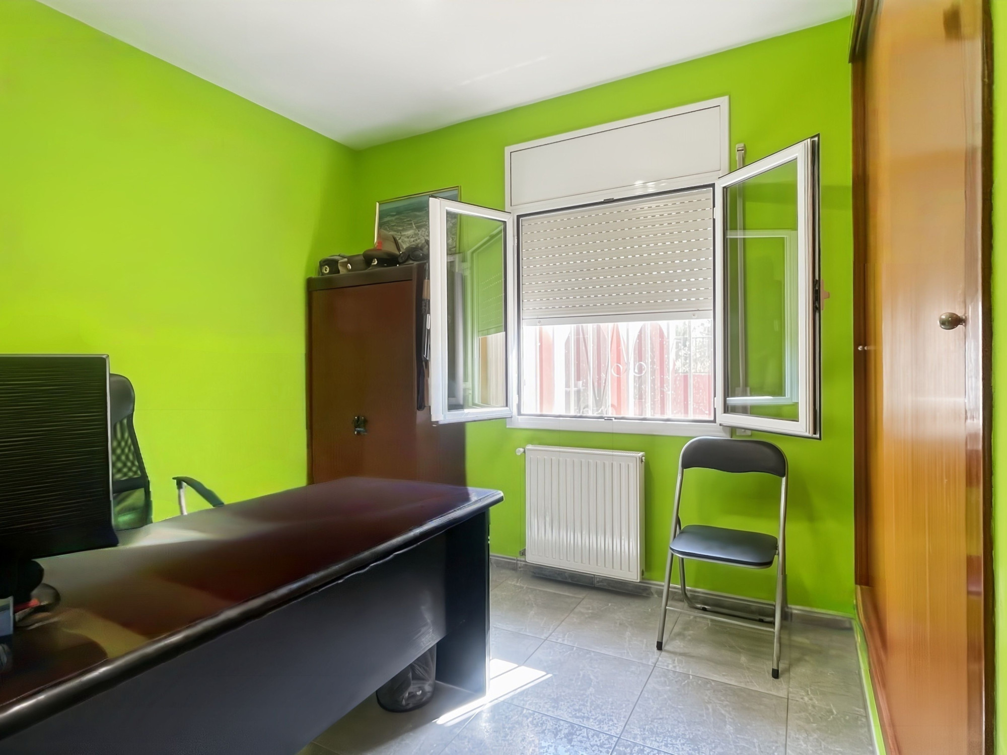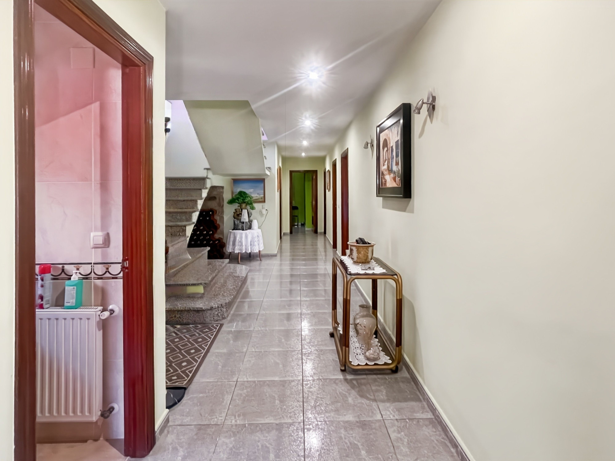 Le rez-de-chaussée comprend un hall d’entrée avec un espace pouvant servir de cave, une cuisine indépendante entièrement équipée et un salon-salle à manger spacieux avec cheminée et accès direct au jardin. Ce niveau dispose également de quatre chambres de bonnes dimensions et de deux salles de bains, l’une avec douche et l’autre avec baignoire.