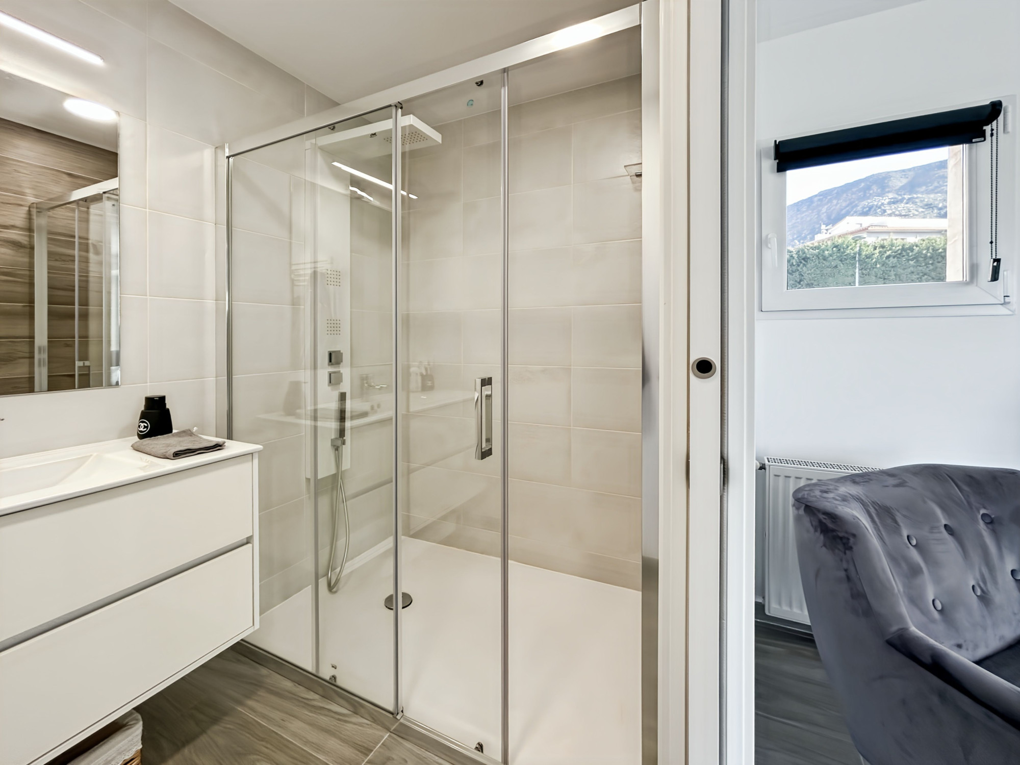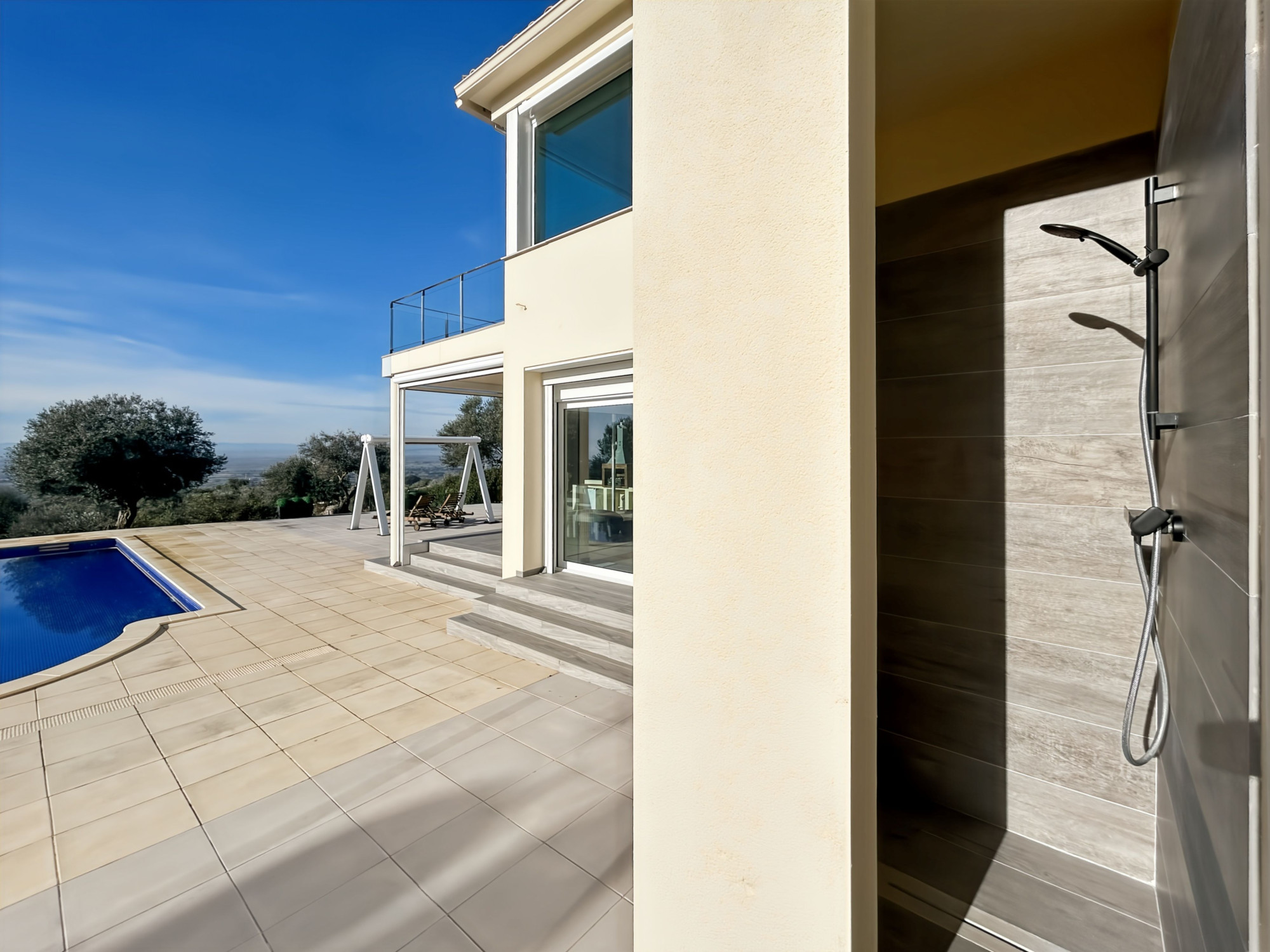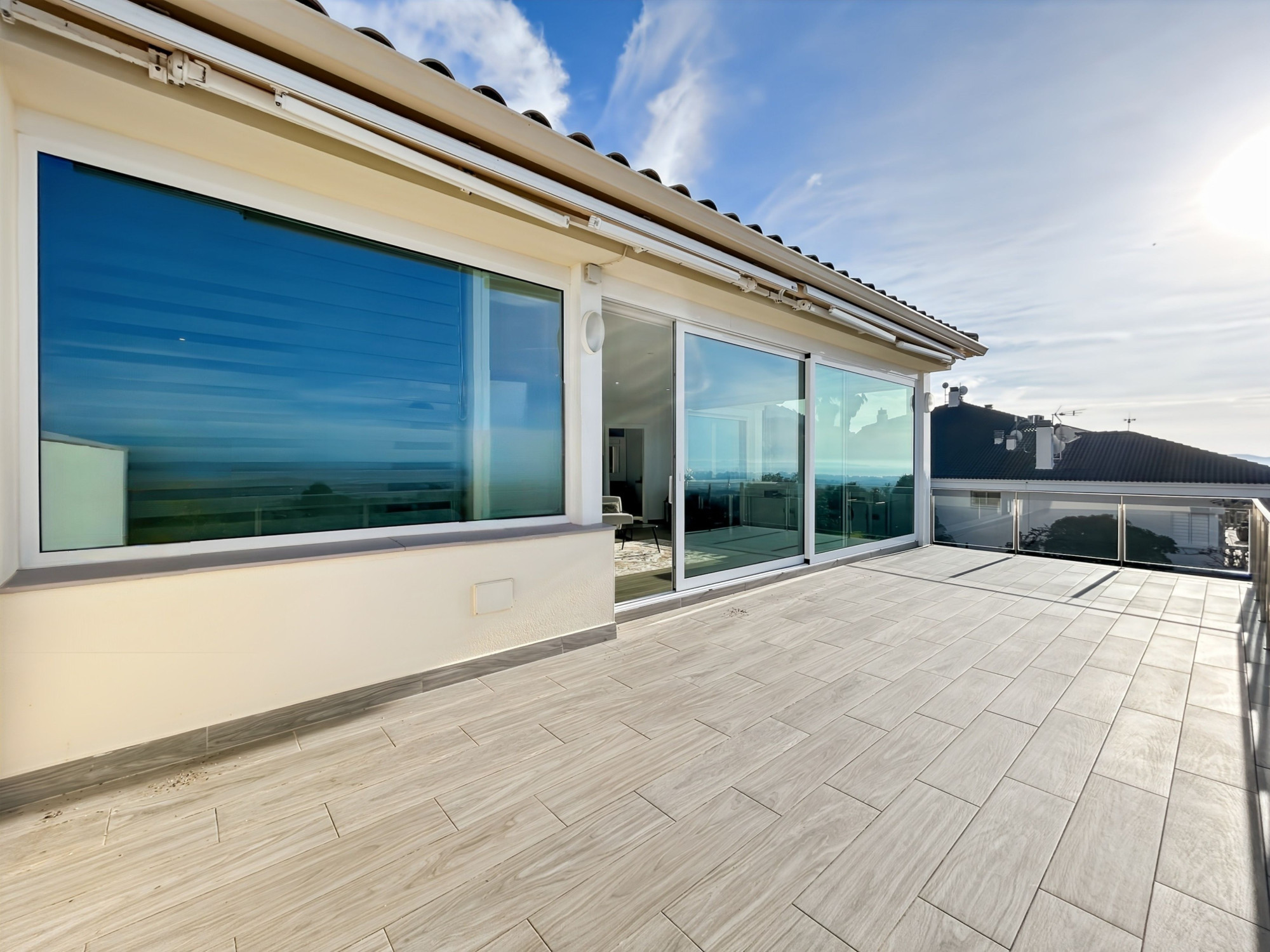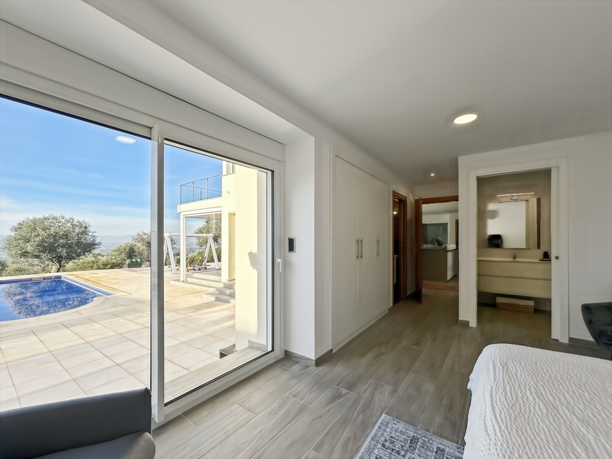 À l’étage, une suite parentale occupant tout le niveau. Grand salon avec terrasse vue dégagée sur la mer, les montagnes et la campagne, équipé d’un store électrique. Grande chambre en suite avec salle de bains comprenant jacuzzi, douche et WC. Dressing de grande capacité. Un espace supplémentaire, actuellement utilisé comme rangement, permet l’installation d’un ascenseur si souhaité.