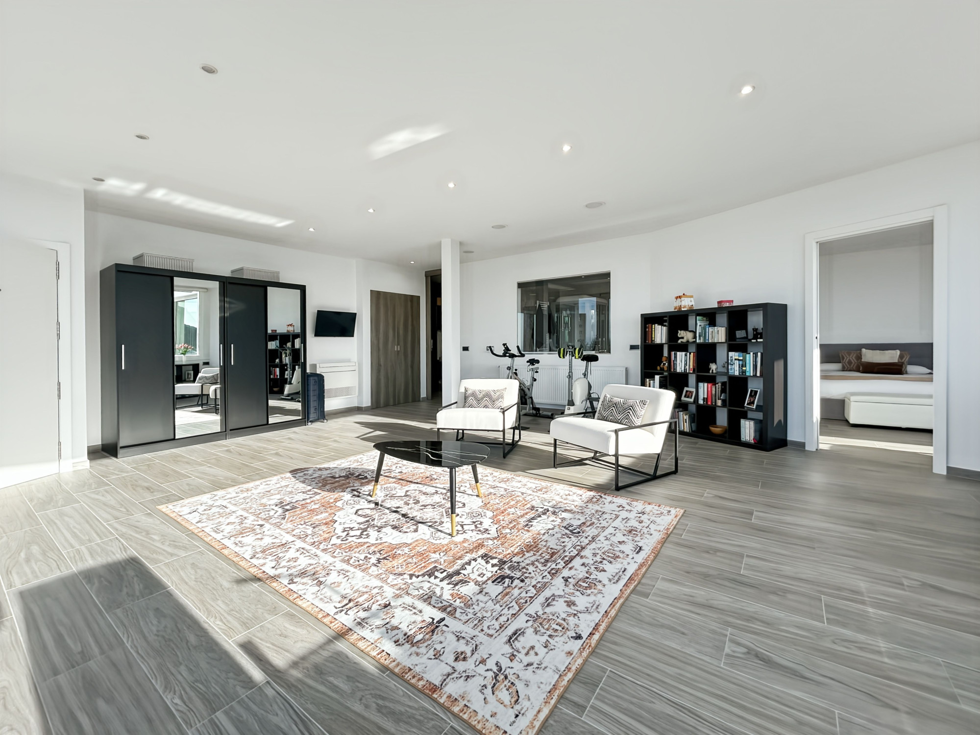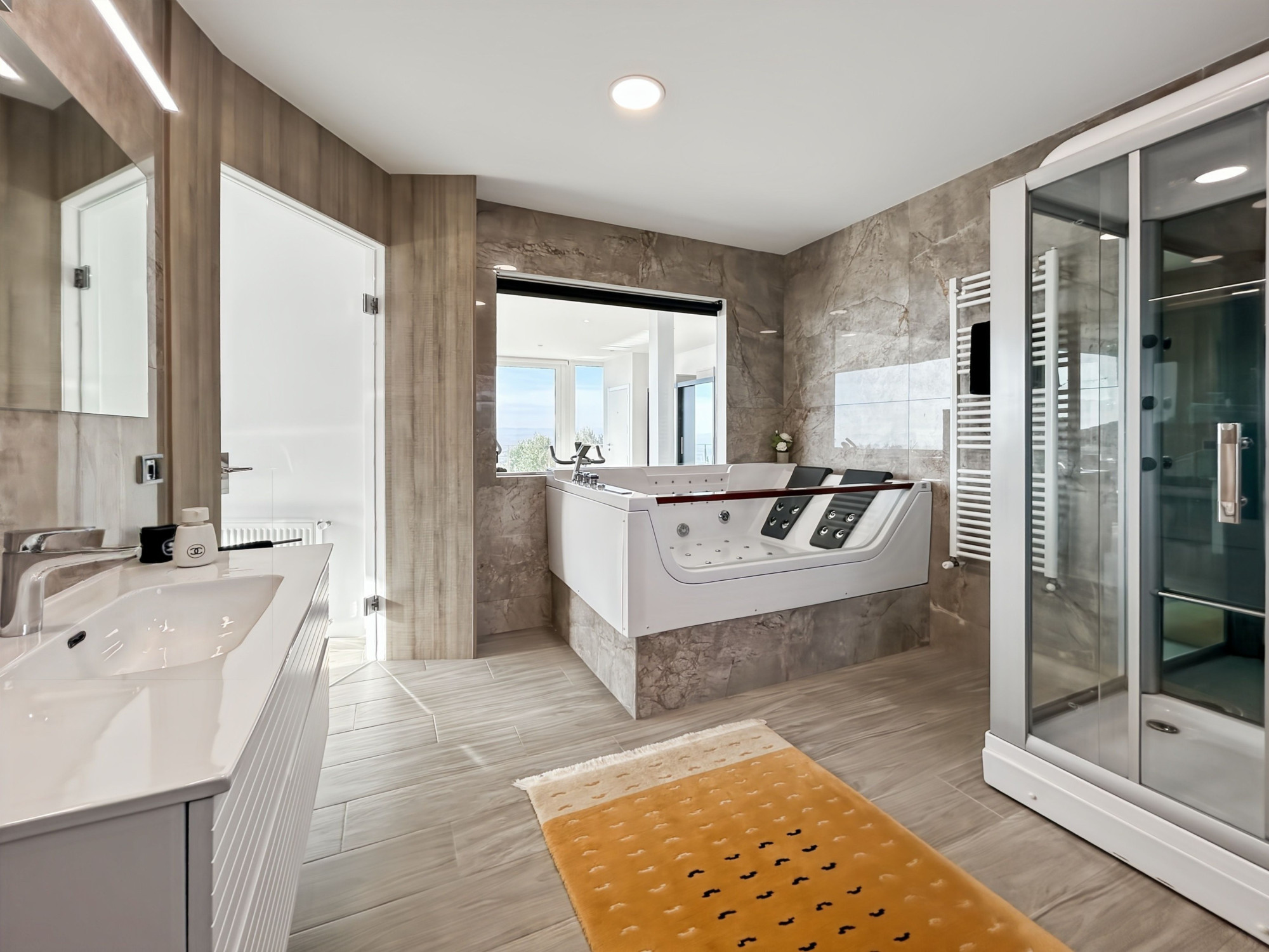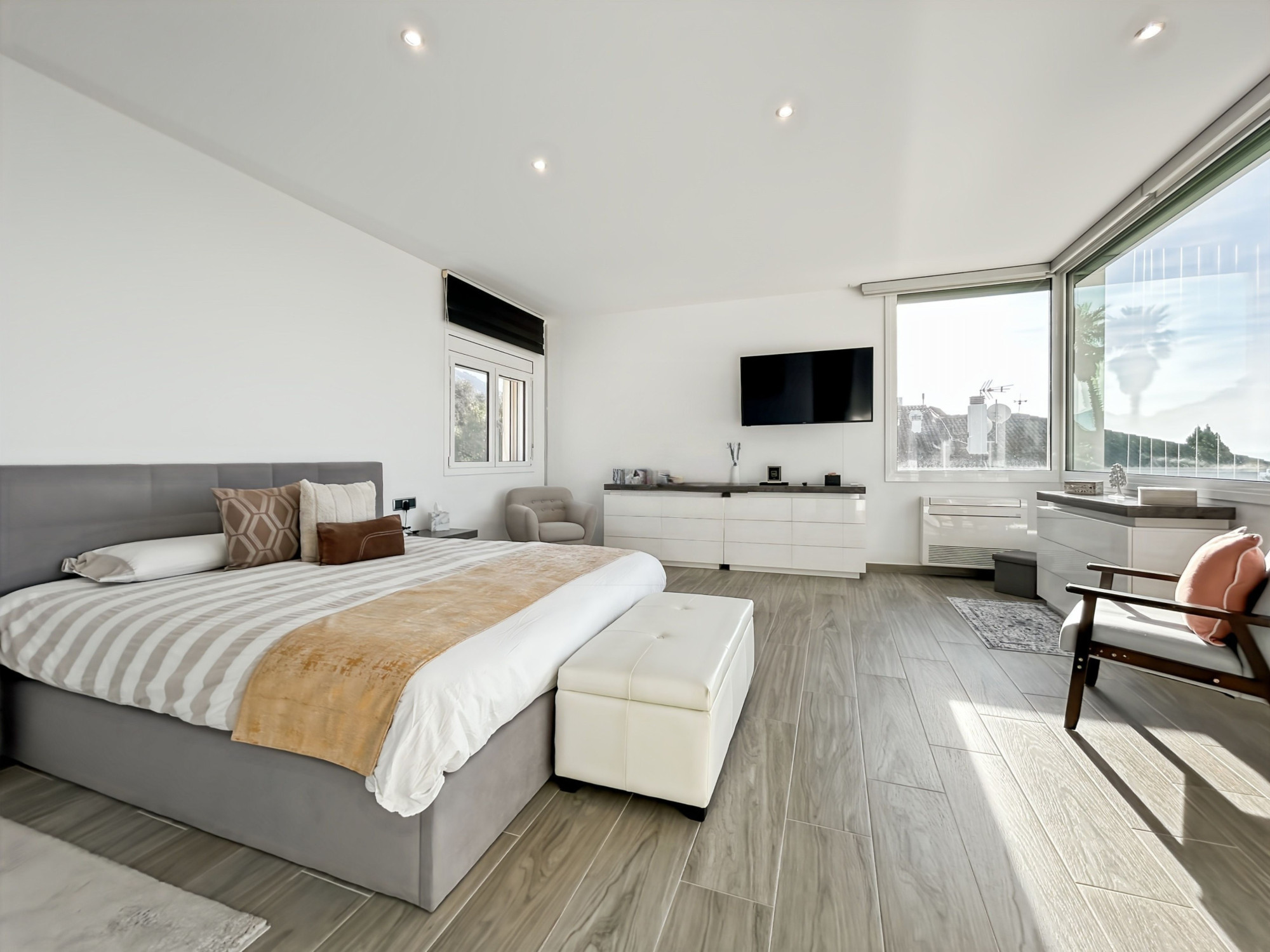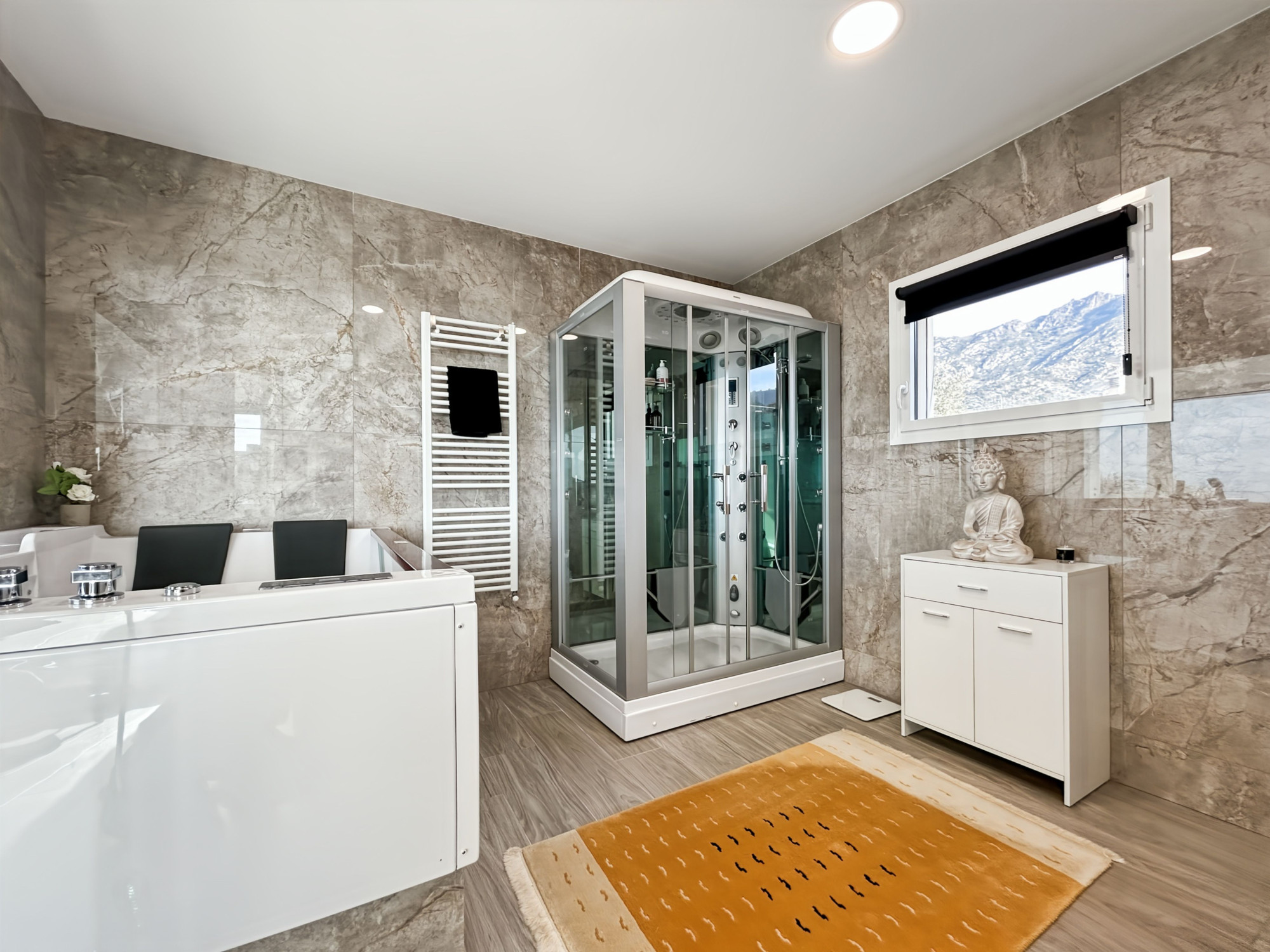 À l’étage, une suite parentale occupant tout le niveau. Grand salon avec terrasse vue dégagée sur la mer, les montagnes et la campagne, équipé d’un store électrique. Grande chambre en suite avec salle de bains comprenant jacuzzi, douche et WC. Dressing de grande capacité. Un espace supplémentaire, actuellement utilisé comme rangement, permet l’installation d’un ascenseur si souhaité.