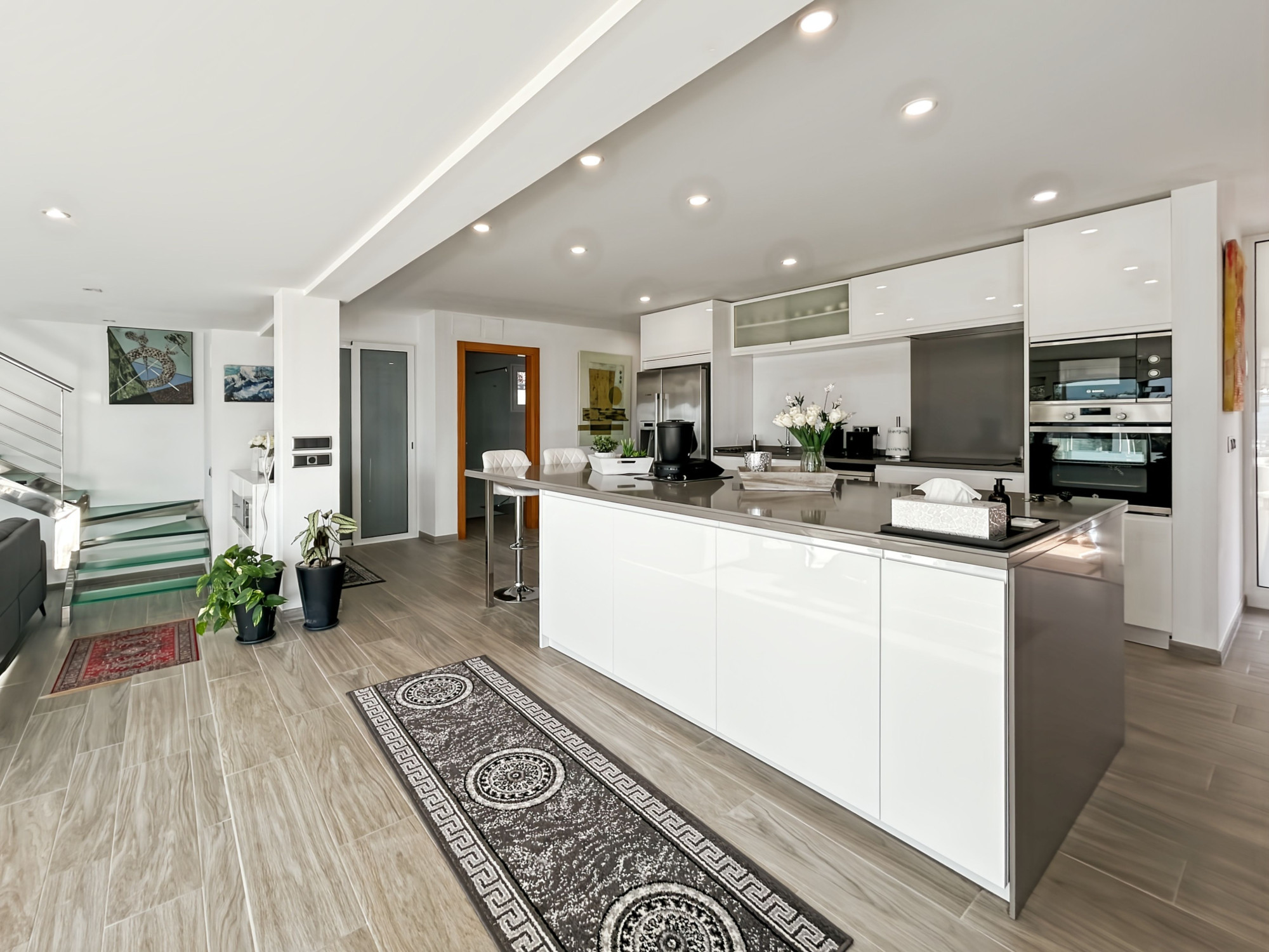 Au rez-de-chaussée, une entrée couverte permet l’accès direct au garage et à la maison. En entrant, une très grande cuisine américaine entièrement équipée, ouverte sur la salle à manger et le salon. Accès direct à la terrasse couverte, au jardin et à la piscine. Trois chambres et deux salles de bains se trouvent à ce niveau, dont une chambre en suite avec salle de bains équipée d’une douche et toilettes séparées, avec accès direct à la piscine.